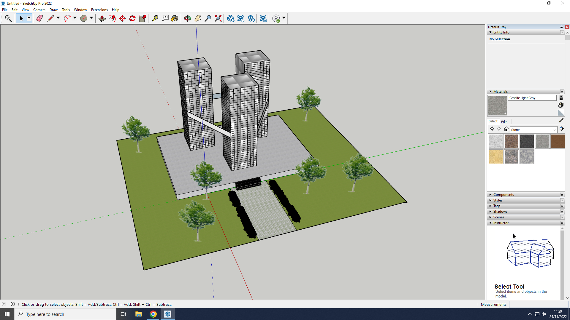 Today I will be blogging my process of creating the final design of the building Tribrid using SketchUp for my major project. This time I used the SketchUp app on the PC instead of the website which is arranged differently. The idea of this concept is a three-tower futuristic building connected by an ongoing bridge between them, each tower is 50 floors and will be a residents/work offices/ entertainment space.