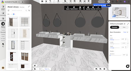 Later on, I decided on a different flooring, I picked marble flooring and chose a greyish walls that separated the bathrooms.